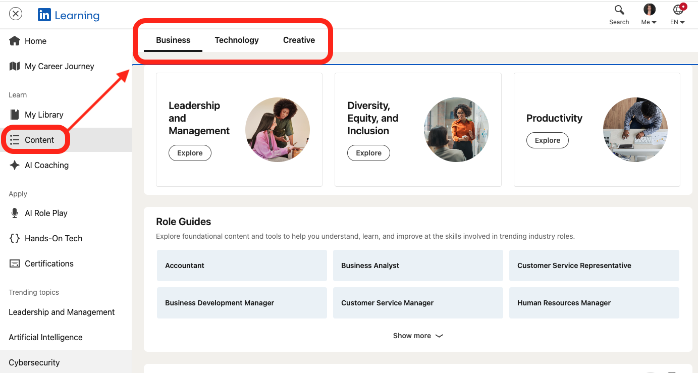 LinkedIn Learning offers courses across three core subjects: business, technology, and creative. Altogether, more than 5,000+ courses are available to explore. To find a course, search for a topic that interests you or browse from one of the subject pages. Here’s a glimpse at the Business page.