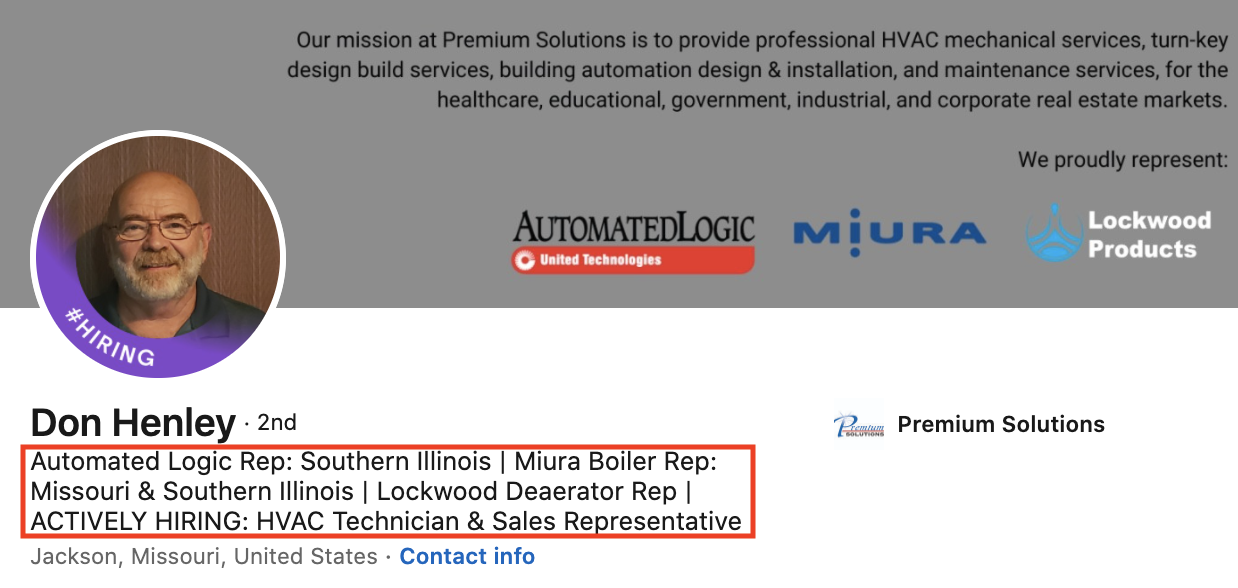 Your headline is another great place to alert your network that you’re hiring. Remember, in search results, both your profile picture and your complete headline will be visible. While the #Hiring profile picture frame only tells people that you’re hiring, your headline gives you the space to specify who you’re hiring. Here’s an example.